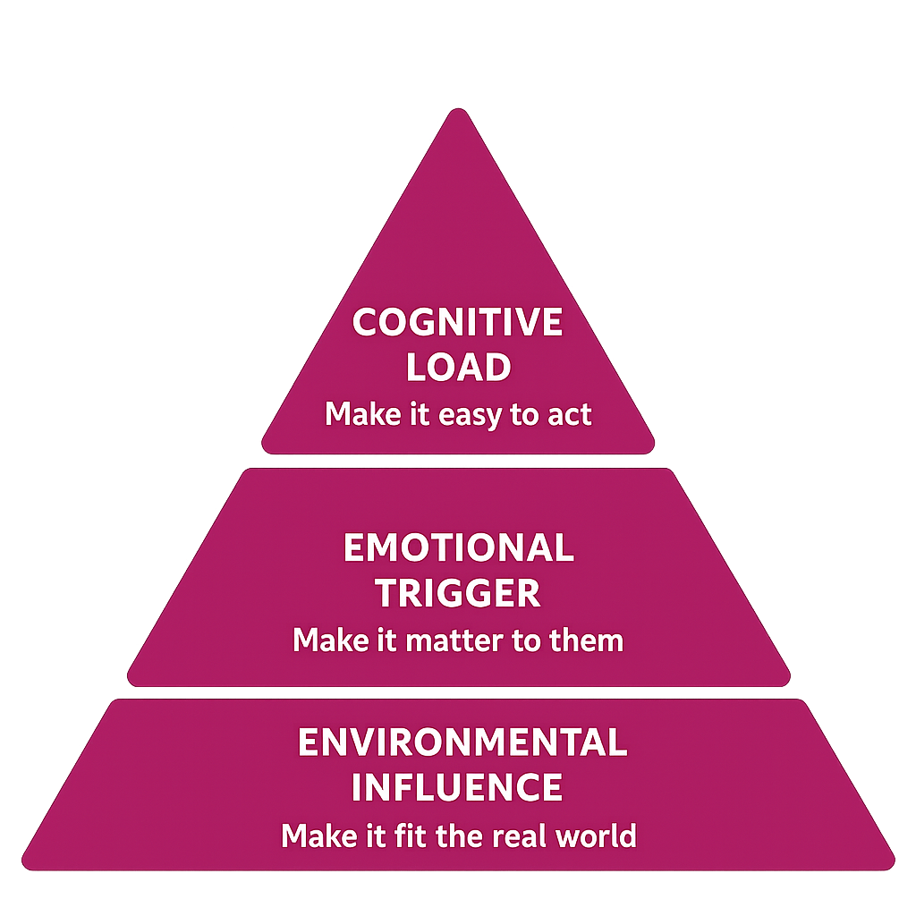- Environmental Influence: Make it fit the real world. Align your message to the user’s actual context: their routines, mindset, timing, and device. Right place, right time, right frame of mind.